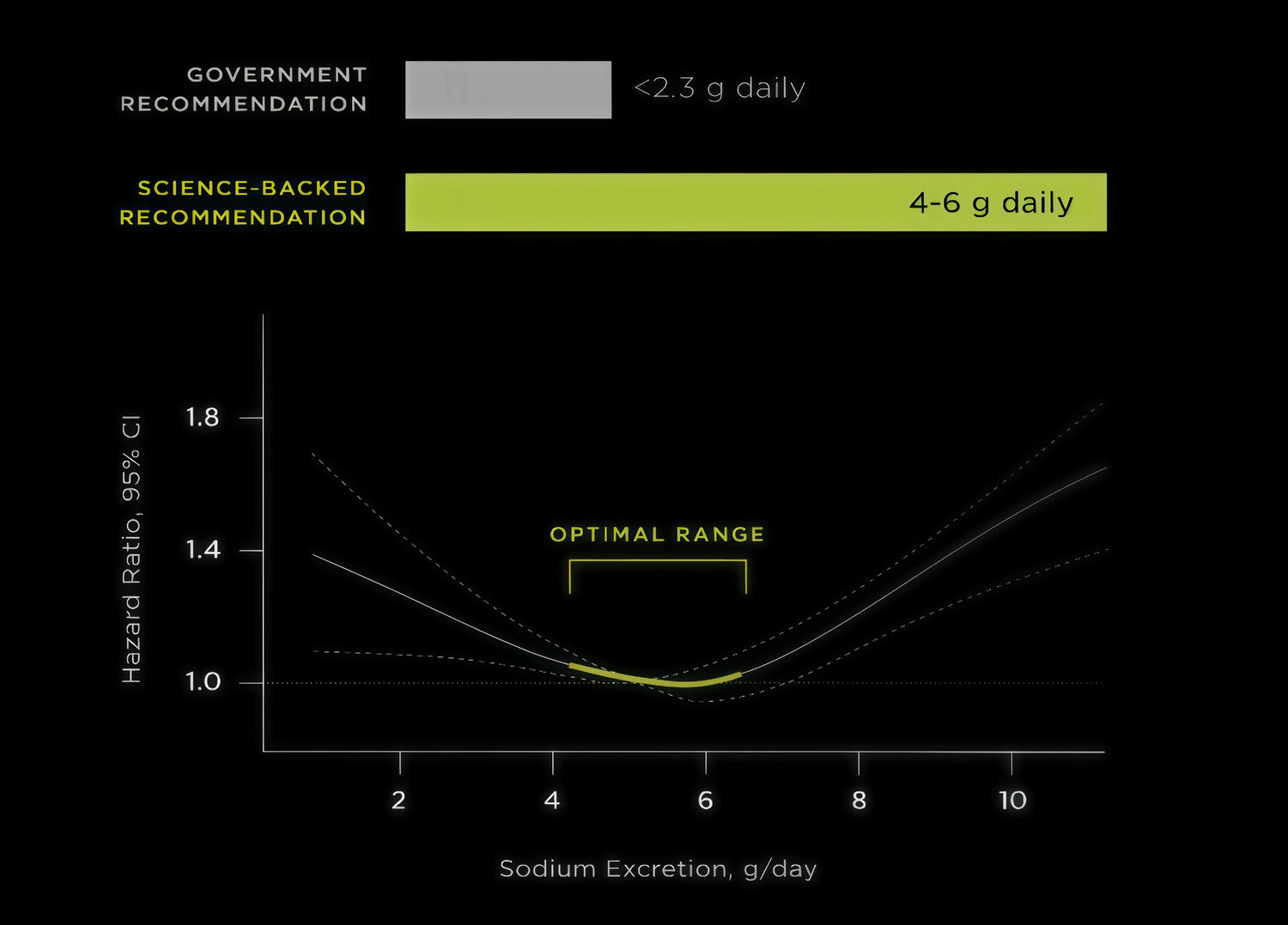 A growing body of research reveals that optimal health outcomes occur at sodium levels 2-3x government recommendations. That’s why we say, More Salt, Not Less.